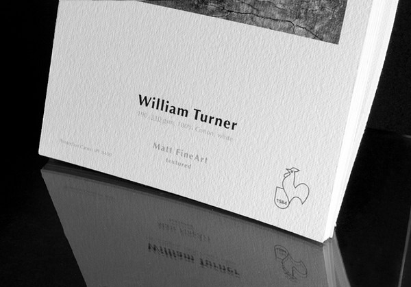 Le papier William Turner – 100% coton blanc – offre une garantie de conservation optimale. Fabriqué à la forme selon la tradition des papiers aquarelle, il se distingue par sa surface texturée caractéristique.