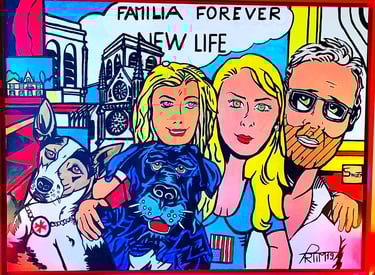 La faculté de Winstone à créer des peintures représentant des portraits de famille dans son univers coloré et influencé par le street art est véritablement fascinante. Ses œuvres capturent non seulement l'essence des relations humaines, mais elles s'inscrivent également dans un mélange vibratoire de couleurs et de formes dynamiques qui reflètent la joie et la complexité des liens familiaux. Par ses choix de teintes audacieuses et de techniques inspirées du graff, Winstone réussit à transcender le portrait traditionnel pour offrir une expérience visuelle immersive, où chaque pièce raconte une histoire unique. Cette approche novatrice et colorée soulève un hommage au quotidien, transformant les moments partagés en une célébration artistique de la vie, qui enchante et captive le regard des spectateurs.